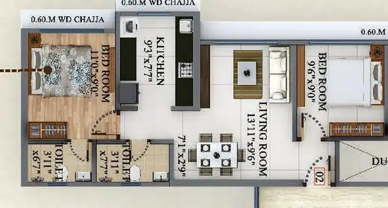2 BHK carpet areas of 543 & 551 sqft,